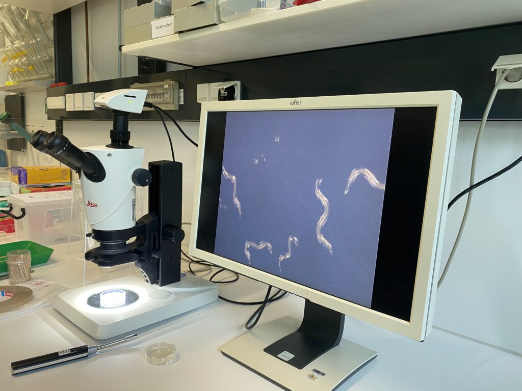 Unter dem Mikroskop übertrugen wir einzelne Würmchen von einer Petrischale zur anderen und sollten sie anschließend mithilfe gesammelter Informationen wie Größe und Aussehen den Entwicklungsstadien zuordnen.