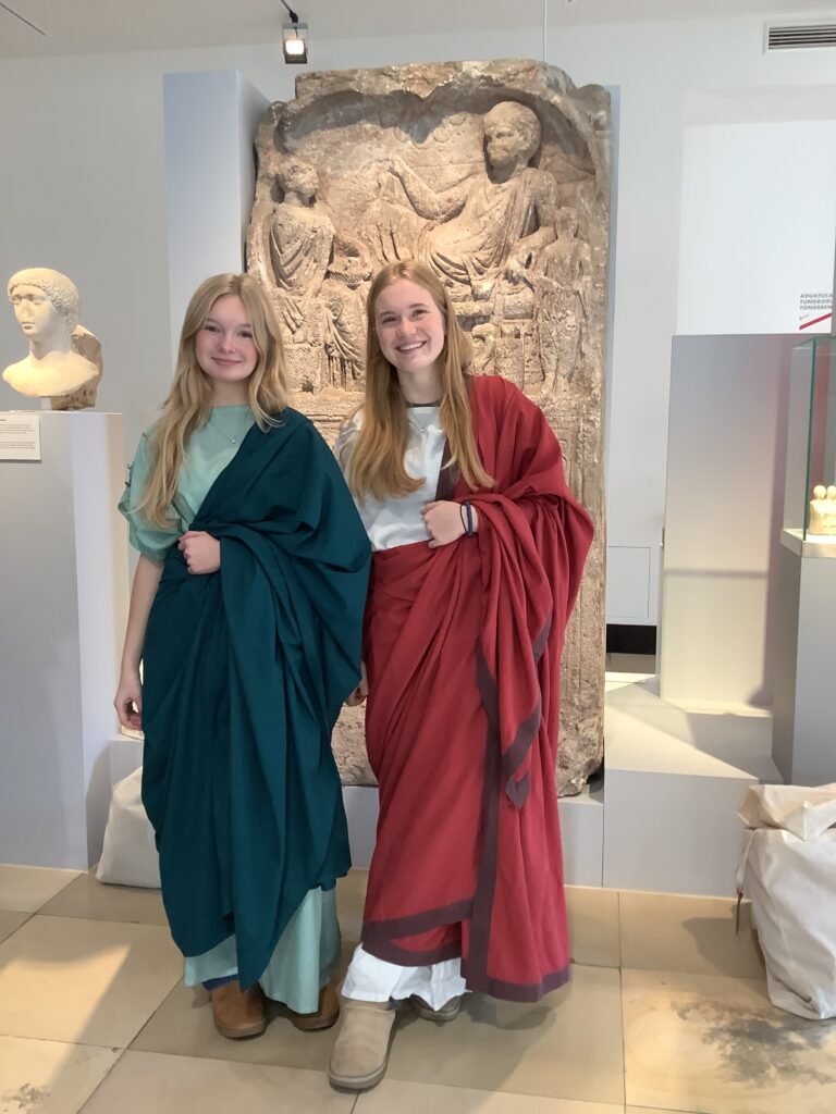 Der bilinguale Geschichts-Grundkurs der EF ist in diesem Schuljahr im Rahmen einer Unterrichtsreihe zur römischen Antike intensiv den Spuren der Römer und Germanen im Rheinland gefolgt.Zunächst beschäftigten wir uns bei einer spannenden Führung im LVR-Landesmuseum in Bonn am 12.11.2025 mit dem römischen Leben am Rhein und konnten auf einer virtuellen 3D-Karte zur römischen Siedlung in Bonn sogar den heutigen Standort des FEG ausfindig machen. Im Anschluss drehte sich in einem Workshop der Zweigstelle des Römisch-Germanischen Museums im Belgischen Haus in Köln alles um das Thema Kleidung. Dort sahen wir zahlreiche faszinierende archäologische Funde, erfuhren viel über die Produktion sowie die geschlechts- und schichtspezifischen Kleidungsgewohnheiten von Römern und Germanen und stellten immer wieder Bezüge zu unserem heutigen Umgang mit dem Thema her. Dank unserer engagierten Workshopleiterin konnten wir auch immer wieder selbst aktiv werden. So wurde uns gezeigt, wie römische Kleidungsstücke wie z. B. Tunika, Toga oder Palla fachgerecht angelegt wurden. Auch germanische Trachten – etwa die typische germanische Hose – durften wir selbst anprobieren und verstehen, dass sie die Römer auch inspirierten. Dabei haben wir nicht nur viel gelernt, sondern hatten auch viel Spaß!