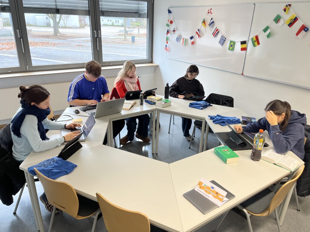 Auf Lettisch „rennt die Zeit, wie der Vogel fliegt“, auf Deutsch „vergeht sie wie im Fluge“. Egal ob auf Finnisch, Spanisch, Maltesisch, Ungarisch – oder eben Lettisch: Derartige Vergleiche hatten unsere fünf FEG-Übersetzer:innen sicherlich am Donnerstag (27.11.) auch im Kopf, als sie beim diesjährigen Übersetzungswettbewerb JUVENES TRANSLATORES innerhalb von 120 Minuten authentische Texte möglichst fehlerfrei und idiomatisch aus unterschiedlichsten Amtssprachen der Europäischen Union übersetzen durften.