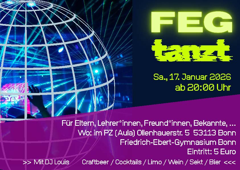 Am Samstag (17.01.2026) ab 20 Uhr ist es wieder so weit. Dann findet die sechste, fast schon legendäre Eltern-Party „FEG tanzt“ im PZ des Friedrich-Ebert-Gymnasiums statt! Feat. DJ Louis; Einlass ist um 20 Uhr; Ende zwischen 2 und 3 Uhr; Eintritt: 5 Euro.
