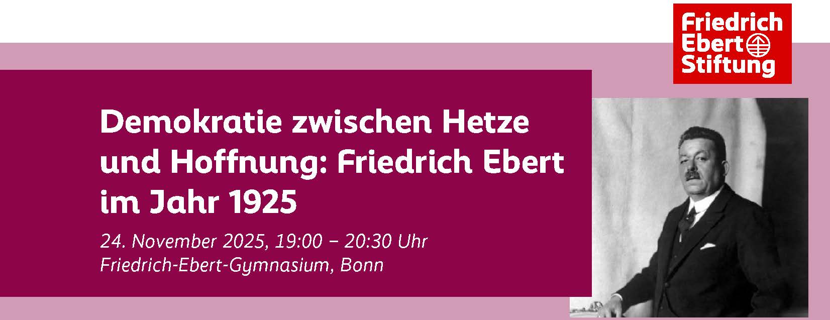Die Veranstaltung findet im Pädagogischen Zentrum (PZ) des Friedrich-Ebert-Gymnasiums statt. Sie ist öffentlich und kostenfrei. Um verbindliche Anmeldung bis zum 20. November 2025 über den Link https://www.fes.de/lnk/5p0 wird gebeten.